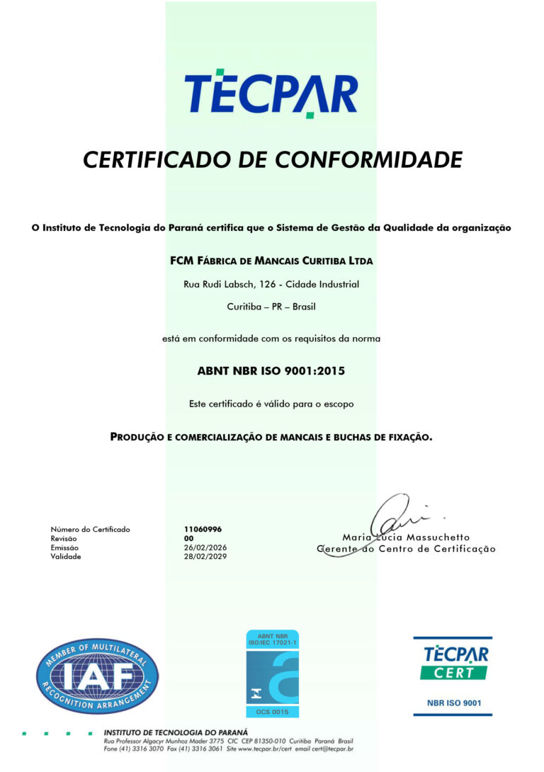Em 2011, a certificação ISO9001, promoveu a continuidade do desenvolvimento empresarial responsável e elevaram ainda mais a qualidade dos produtos e serviços FCM.